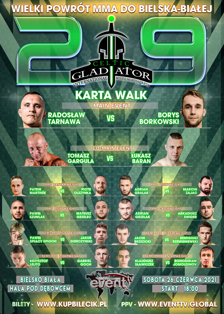 W kwestii organizacji gali federacja zawarła stosowne porozumienie z miastem Bielsko-Biała które będzie współorganizatorem Gali, to oznacza, że Celtic Gladiator w odsłonie nr 29. zagości pod Dębowcem. – Kartę walk mamy w znacznym stopniu już skompletowaną. Podstawą było to, aby zapewnić kibicom jak największą dawkę emocji i rywalizacji na wysokim poziomie. Systematycznie będziemy ogłaszać kolejne nazwiska zawodników, którzy powalczą na czerwcowej gali – mówi prezes Jarzębak. Wiadomo już, że ponownie pojedynki stoczą „u siebie” reprezentanci wspomnianego bielskiego